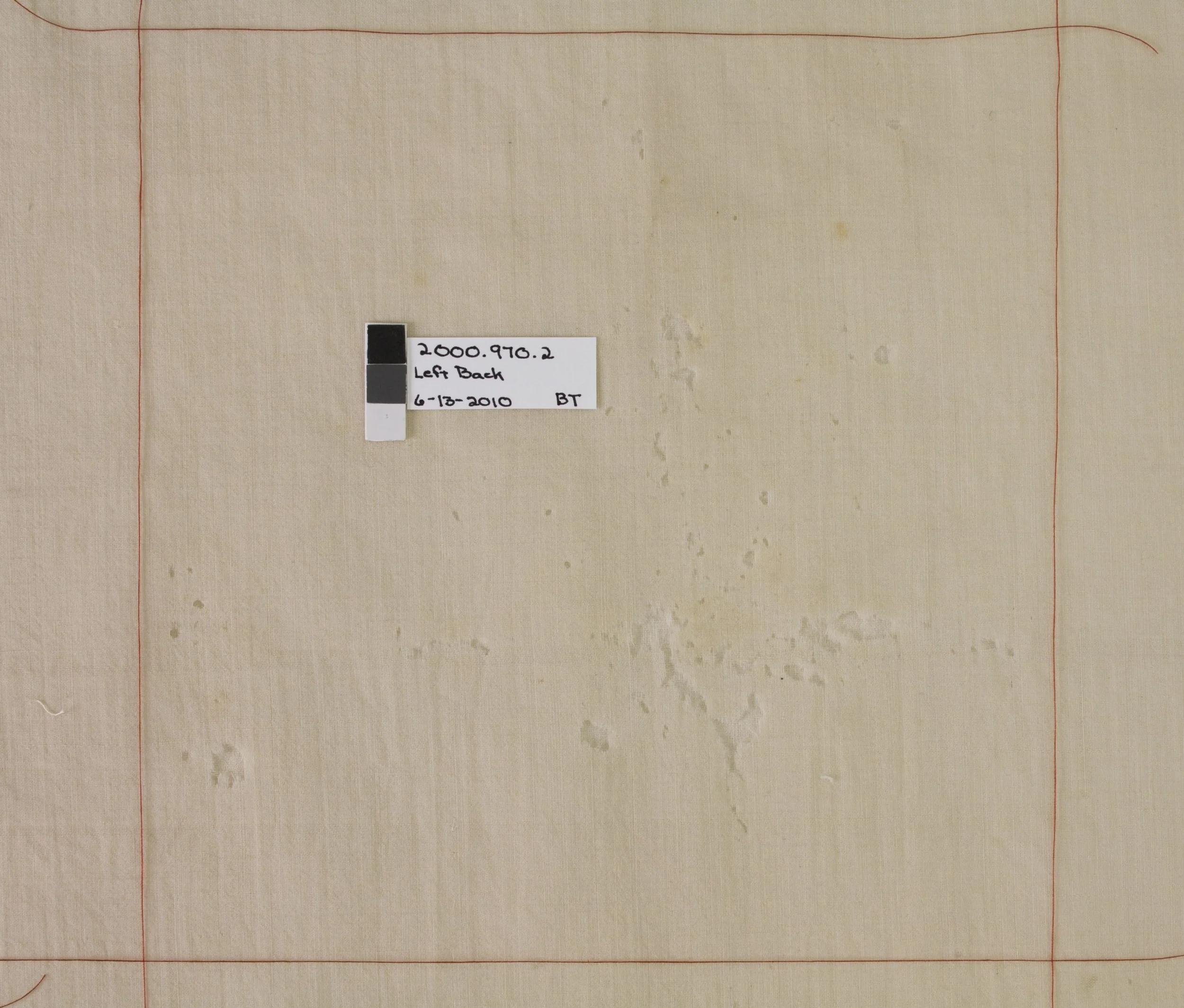 Most important to this treatment was choosing the perfect lining fabric that would add color compensation as well as the proper support but also drape as the original wool fabric. Contact humidification was utilized to flatten the original fabric before lining. Stitch stabilization was used to combine the panels with laid and couching stitches to stabilize the holes.